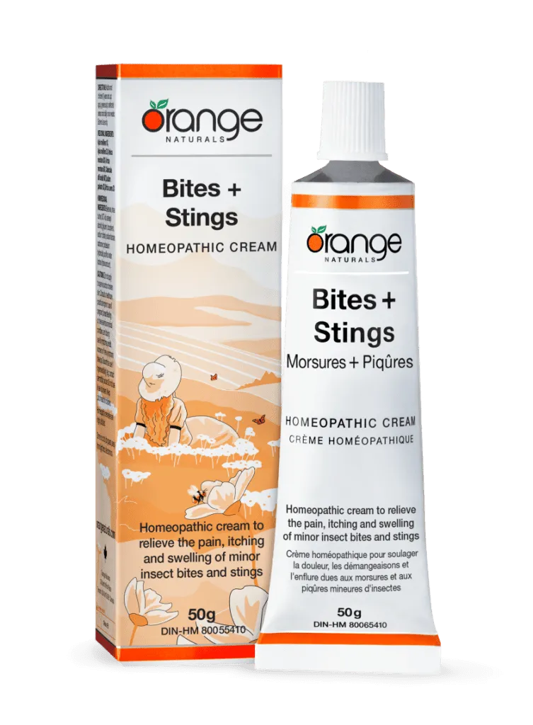 We may all love the out-of-doors but we don’t all love the critters that nibble on us when we’re outside enjoying nature. Inevitably each spring, summer or fall most of us will have a ‘run-in’ with a mosquito, a black fly, a spider, a deer fly or a wasp. That ‘run in’ may lead to a mild little itch or to a great deal of swelling, discomfort, inflammation, redness or burning. Orange Naturals Bites+Stings homeopathic topical cream will help you find quick relief from those inevitable run-ins with mother nature’s tiny but mighty insects. Keep a tube in your picnic hamper, your backpack, the baby’s diaper bag, the bow of your canoe or your jacket pocket.