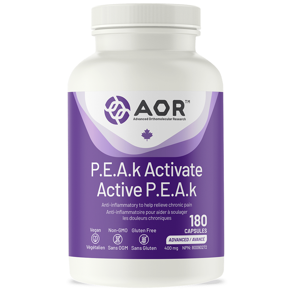 AOR’s P.E.A.k Activate is a natural, science-backed formula designed to reduce chronic pain and inflammation. It contains high-purity palmitoylethanolamide (PEA), a molecule that naturally supports the endocannabinoid system and is known for its anti-inflammatory and neuroprotective properties.