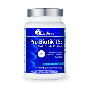 CanPrev’s Pro-Biotik™ 15B is a shelf-stable probiotic capsule formula containing five critical probiotic species naturally found in the human intestinal tract, including bifidobacteria and lactobacilli. Each species is represented at optimal levels to enhance the natural gut flora and provide a health benefit. Pro-Biotik™ 15B is completely shelf stable for ease of use anytime, anywhere – no refrigeration is required. At the time of manufacture, CanPrev’s Pro-Biotik™ 15B contains forty billion CFU’s (colony forming units – a measure of friendly bacteria activity). By the time it reaches its expiry date it is still guaranteed to have an activity level of 15 billion CFU’s – now that’s impressive! Keep a bottle of ProbiotikTM 15B in your bag, knowing with confidence that you have a probiotic that works for you, wherever life takes you.
