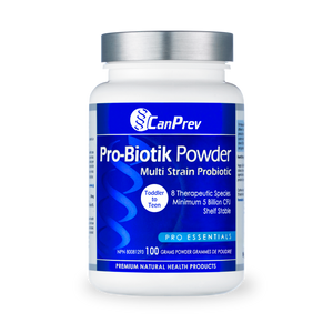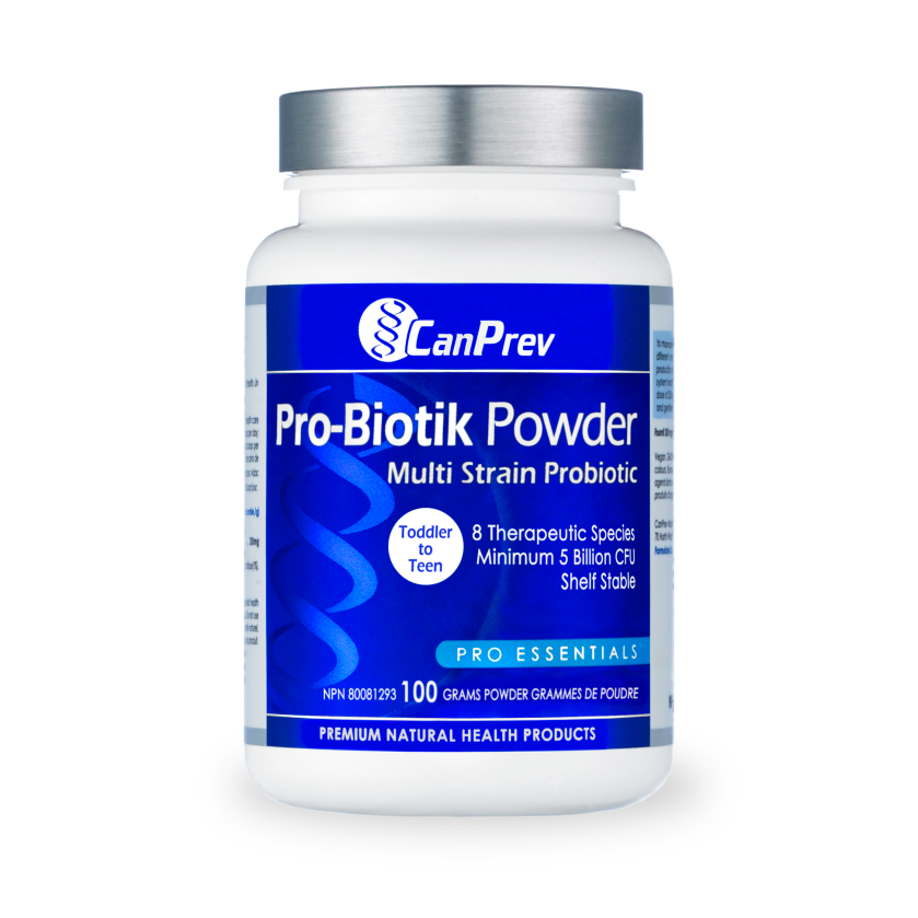 CanPrev’s Pro-Biotik™ Powder is a family friendly probiotic powder that contains eight human strain probiotic species particular to the growing needs of toddlers, children and adolescents. Each species is represented at optimal levels to enhance the natural gut flora. Pro-Biotik™ Powder is completely shelf stable for ease of use anytime, anywhere – no refrigeration required. At the time of manufacture, it contains eight billion CFU (colony forming units – a measure of friendly bacteria activity), and three billion CFU at the expiry date.