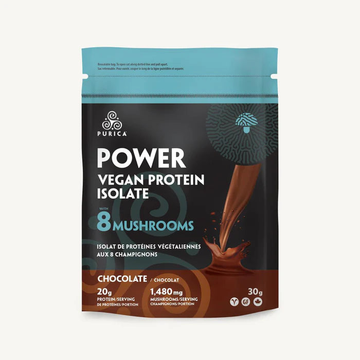 PURICA Power uniquely combines vegan protein with micronized Chaga, Lions Mane, Red Reishi, Cordyceps, Shiitake, Maitake, Agaricus and Coriolus mushrooms, offering a natural, clean fuel for the body. This protein powder blends fermented pea, organic sprouted brown rice, and ProHydrolase® enzymes, delivering a distinct mix that's both nutritious and delicious, even with water.
