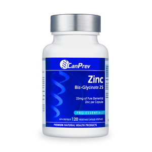 CanPrev’s Zinc Bis-Glycinate 25 is the preferred form of zinc due to its superior absorption and gentleness. Daily intake is important, as we excrete what we don’t use or absorb. The mineral zinc plays an important role in several bodily functions including proper wound healing, taste, vision, cognitive health, immunity, blood sugar support, and normal glandular function. It’s also an essential component of the body’s antioxidant enzymes, superoxide dismutase (SOD) and glutathione peroxidase.