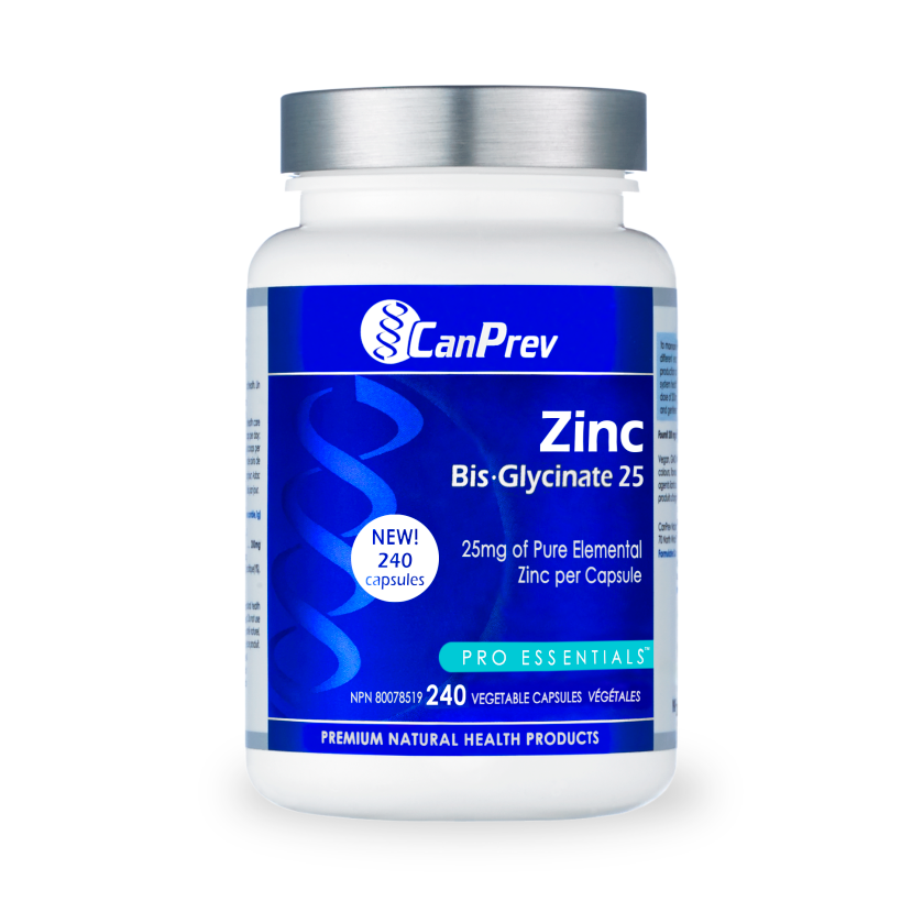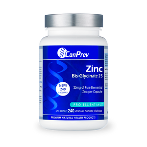CanPrev’s Zinc Bis-Glycinate 25 is the preferred form of zinc due to its superior absorption and gentleness. Daily intake is important, as we excrete what we don’t use or absorb. The mineral zinc plays an important role in several bodily functions including proper wound healing, taste, vision, cognitive health, immunity, blood sugar support, and normal glandular function. It’s also an essential component of the body’s antioxidant enzymes, superoxide dismutase (SOD) and glutathione peroxidase.