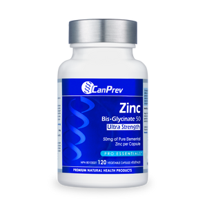 CanPrev’s Zinc Bis-Glycinate 50 Ultra Strength provides ultra strength support for acute needs. An ideal dosage that supports poor wound healing, recurrent infections, and many enzymatic reactions at a cellular level. Zinc bis-glycinate is the preferred form of zinc due to its superior absorption and gentleness.
